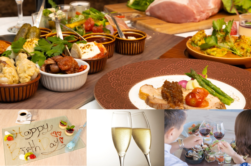 ・ボリューム満点ギリシャ料理の前菜盛り合わせ・お食事・フレンチ風ローストポーク・デザートアート、コーヒー付。 ※季節により異なります。・ローストポーク・デザートアート メッセージ付 パン・コーヒー付 ※デザートのメッセージを事前にホテルまでご連絡ください