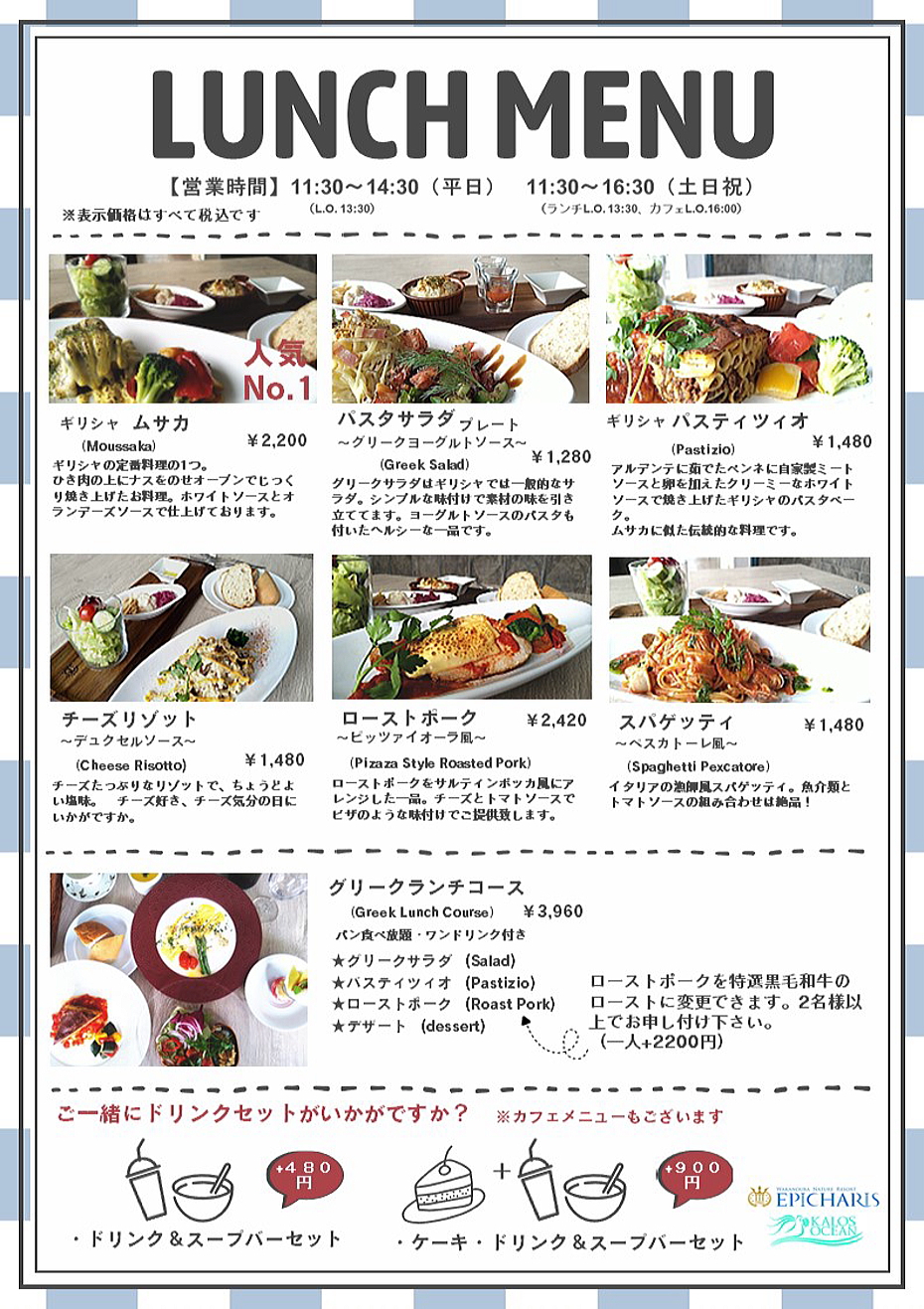 気軽にギリシャ料理を堪能したい方向け。ギリシャの有名なお料理をコース仕立てでご提供致します。フレンチのシェフが考案した日本人向けのギリシャ料理をご堪能下さい。量は程よい量でのご提供となっております。